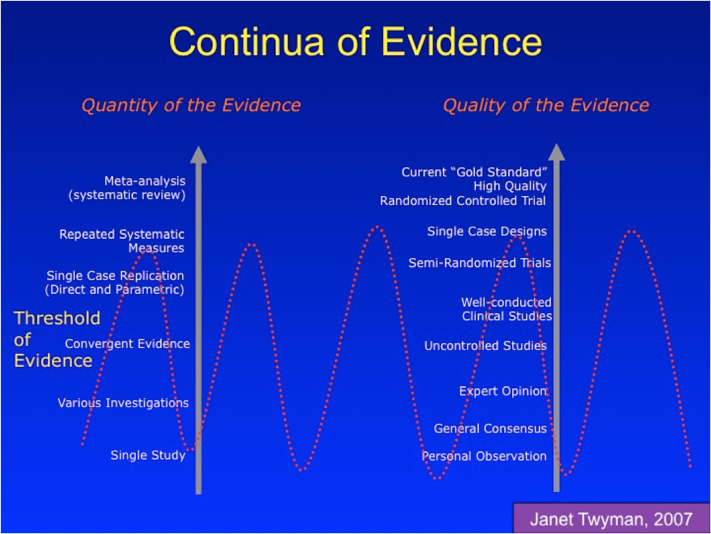 The concept of best available evidence suggests that evidence falls along a continuum from very strong evidence at one end to very weak evidence at the other end. In an evidence-based model, results of research are interpreted on continua of evidence to determine if the conclusions exceed the threshold required for making smart choices. The continuum offers a means to evaluate two fundamental factors that reflect the value of evidence for making critical decisions: the quantity of the evidence and the quality of the evidence.