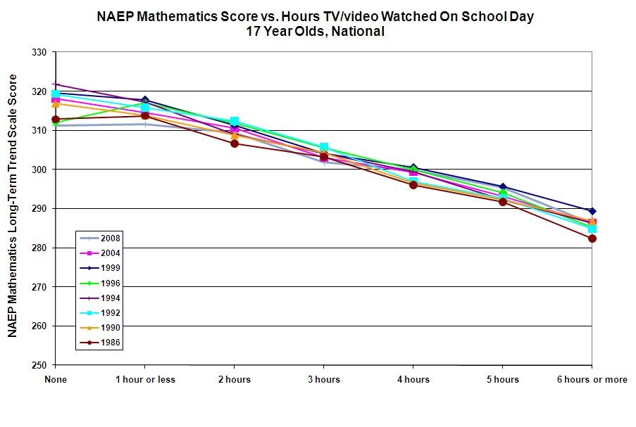 Results: Strong correlation between NAEP Math Long-Term Trend Scale Score and TV/video watching 2 hours or more on school nights, with more hours watching corresponding to lower scores. General improvement in scores from 1986 to 1996, then drop in scores from 1999 to 2008.